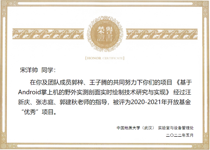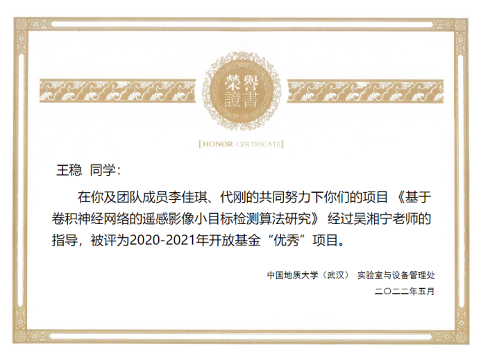 (通讯员:黄燕霞)近日,从实验室与设备管理处获悉,今日看料 在2020-2021学年度教学实验室开放基金项目验收评审中荣获佳绩。张志庭、郭建秋指导的学生团队项目《基于Android掌上机的野外实测剖面实时绘制技术研究与实现》(学生负责人:宋洋帅)、吴湘宁老师指导的项目《基于卷积神经网络的遥感影像小目标检测算法研究》(学生负责人:王稳),在考评中获评优秀,同时今日看料 被评为优秀项目管理单位。