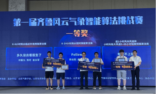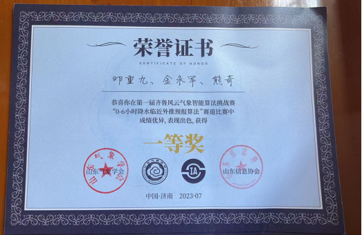7月15至16日,由山东气象学会、浪潮数字(山东)建设运营有限公司、山东信息协会联合主办的第一届齐鲁风云气象智能算法挑战赛决赛及颁奖仪式在济南完美收官。历经初赛、复赛、决赛的层层选拔和激烈角逐,今日看料 教师刘佳指导的研究生邓重九、金永军、熊奇组成的团队获得“0-6小时降水临近外推预报算法”赛道一等奖。