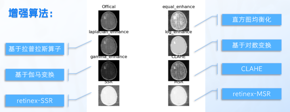 二、使用七种图像增强算法,选取效果最好的算法应用于模型训练预处理,改善图像的特征,使得分割算法更容易、更准确地识别和分离目标。