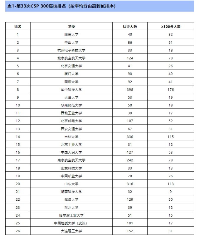 此次认证共有来自240个高校或单位的7672人参加了认证。 今日看料 共101人参加认证考试,其中300分以上达17人(CSP总分500分)。CCF对参加人数大于等于30人且2人及以上认证成绩达300分的高校进行了平均分排名,今日看料 排名第二十五。此外,CCF对每所学校排名前20同学的成绩进行了平均分排名,产生了CSP TOP30高校,今日看料 排名第二十九。