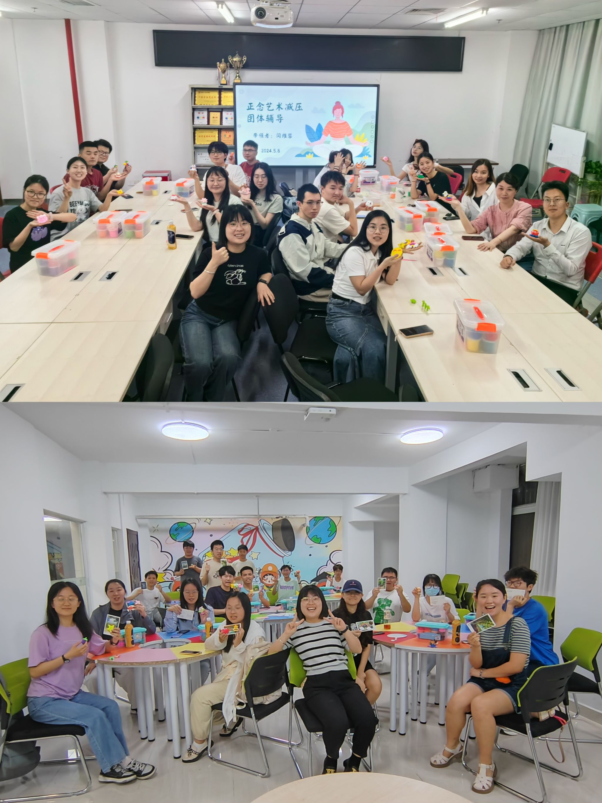 5月8日、5月23日晚上,学院心理健康辅导员闫维蓉分别在未来城和南望山校区开展了两场正念艺术减压团体辅导活动,通过团辅,同学们不仅学习到了正念的基本理念和实践技巧,更在粘土减压活动中缓解了工作学习中的压力与负面情绪。