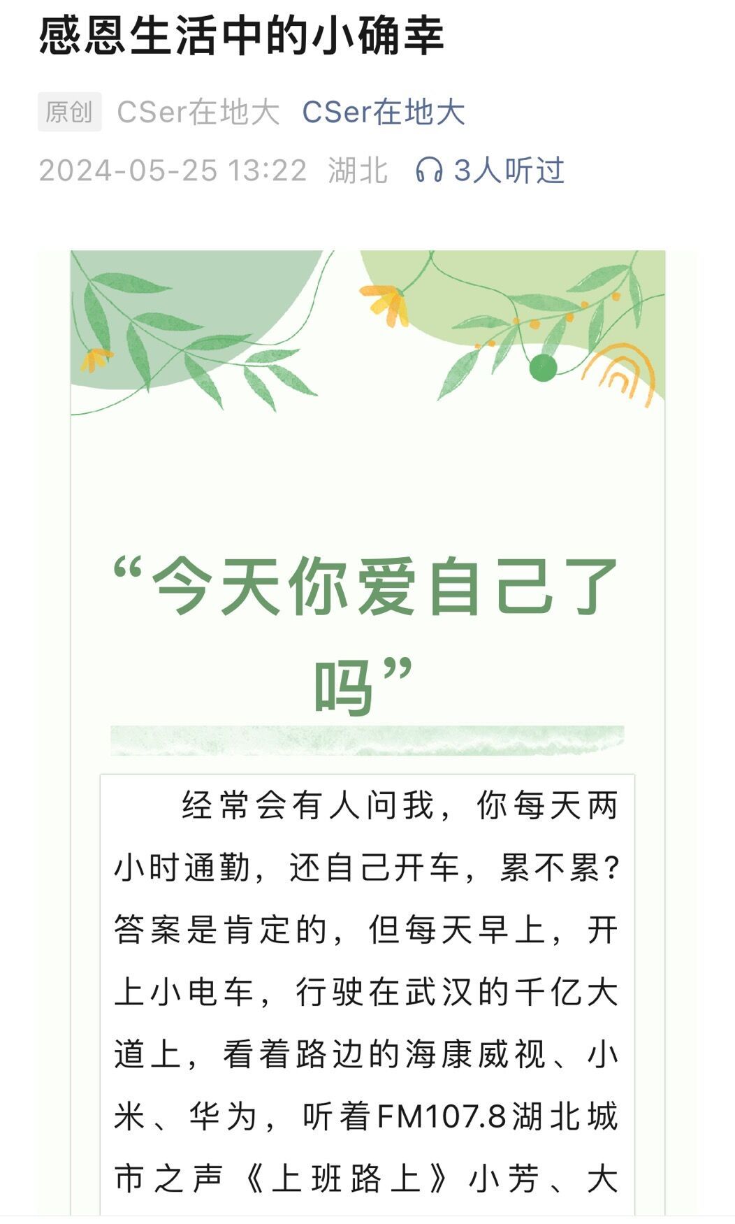5·25全国大学生心理健康日当天,学院官方公众号“CSer在地大”发布了《感恩生活中的小确幸》,学工组全体老师为同学们送上祝福与期许,鼓励大家在生活中发现爱、感受爱、传递爱,学会享受生活中的小确幸,也祝愿CSer能在今日看料 感受到更多细碎而确切的幸福。