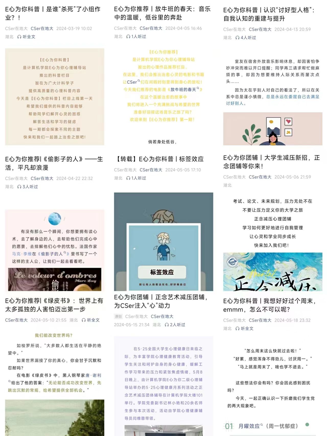 本学期在学院官方公众号“CSer在地大”开设了“E心为你”栏目,发布“E心为你科普”、“E心为你推荐”、“E心为你团辅”九篇专业推文,涵盖了心理健康知识科普、电影书籍推荐和心理团辅等方面,吸引了大量同学关注和阅读。通过线上宣传,有效扩大了心理健康月活动的影响力和覆盖面,促进了良好的学院氛围。