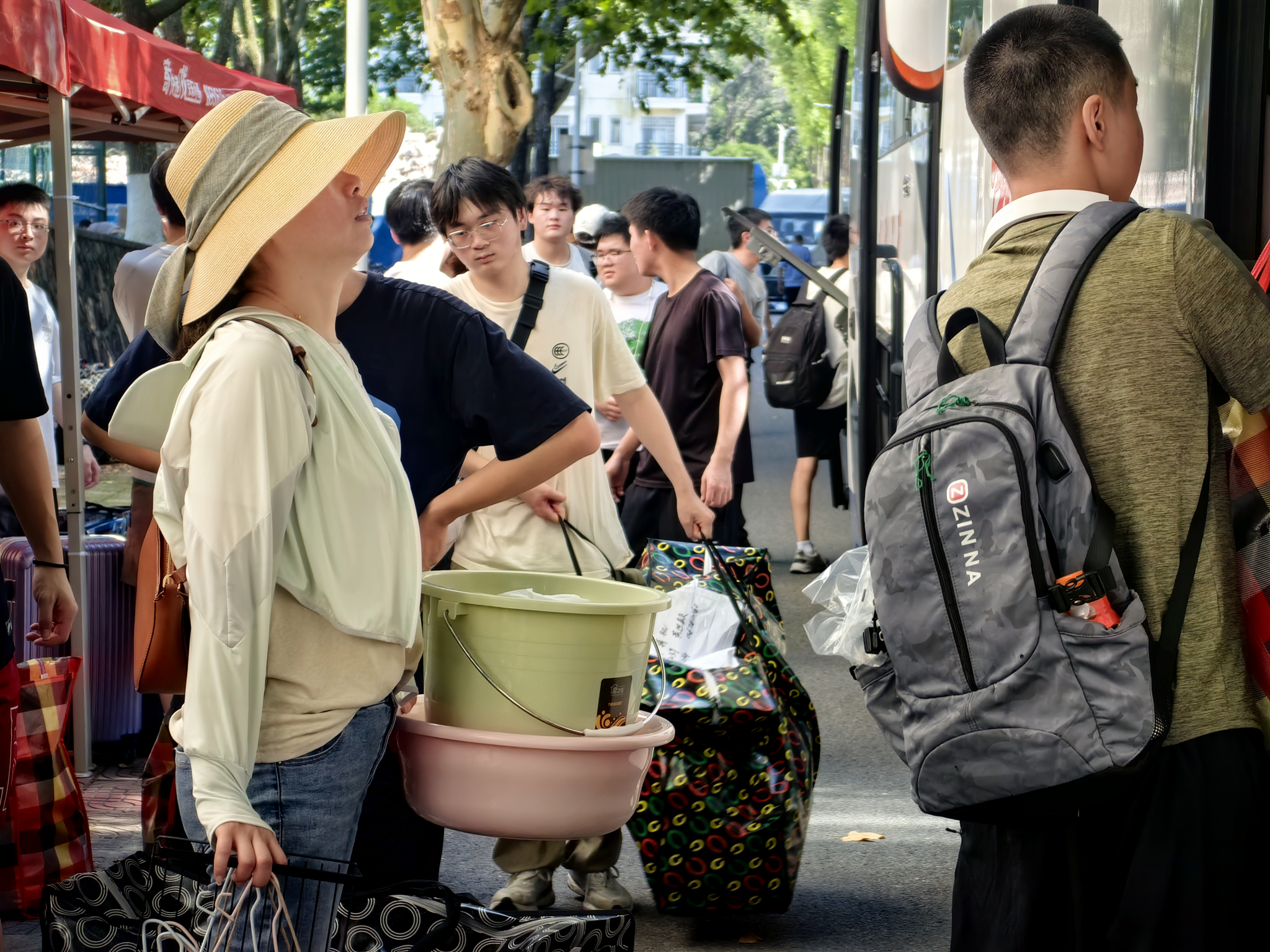 同学们早已打包好行李在楼下等待,随着搬运车辆逐次停下,大家自觉组成流水线相互接力,一件件纸箱、行李箱、储物袋最终被罗列得整整齐齐。尽管天气炎热,但大家的热情不减,许多男生主动帮助女生搬运行李,在各位老师的指挥下,一切都在有条不紊地进行。