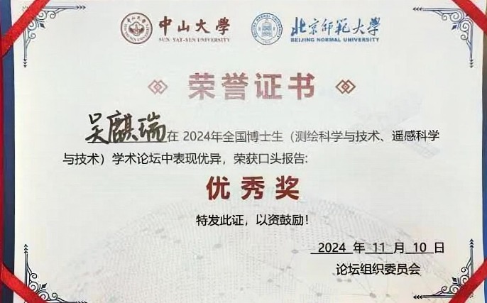 团队研究生田苗博士、吴麒瑞博士分别做了题为“地质知识图谱的构建及推理应用”,“融合知识图谱与机器学习的灾害易发性评价”的报告,并在优秀报告奖评选中分获二等奖和优秀奖。