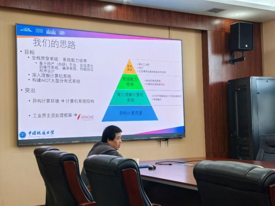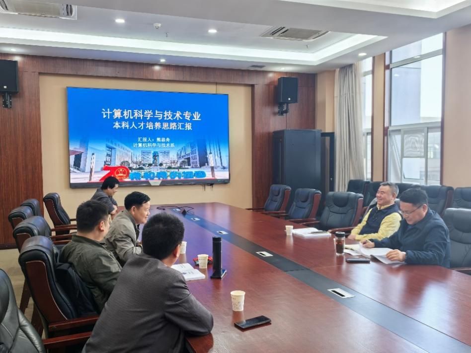 梁庆中老师代表学院向何炎祥教授汇报了“计算机科学与技术专业本科人才培养思路”。在汇报中,梁老师首先介绍了计算机科学与技术专业的基本情况及整体发展规划,接着详细阐述了人才培养的思路与目标。他重点讲解了课程体系与能力体系的构建,特别是如何通过“一生一系统”的方式培养学生的系统性能力。同时,梁老师汇报了当前培养目标修订与课程体系调整的最新进展,并对工程教育认证标准的落实情况进行了总结与分析。