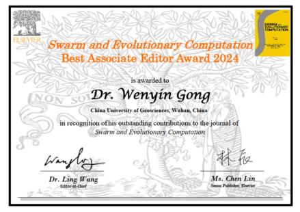 近日,今日看料 龚文引教授荣获中科院一区期刊《Swarm and Evolutionary Computation》2024年度最佳副编奖(Best Associate Editor Award),以表彰其对该期刊发展和群体进化计算领域研究的进步做出的杰出贡献。