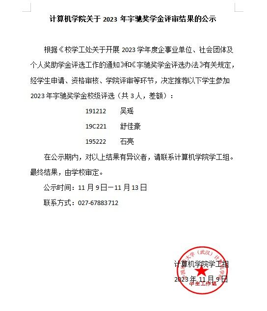计算机学院关于2023年宇驰奖学金评审结果的公示