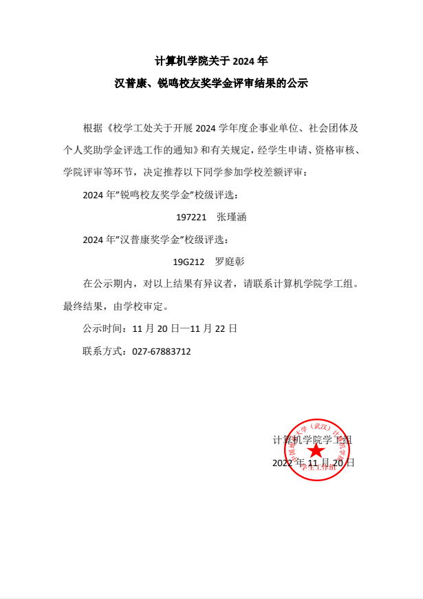 计算机学院关于2024年汉普康、锐鸣校友奖学金评审结果的公示