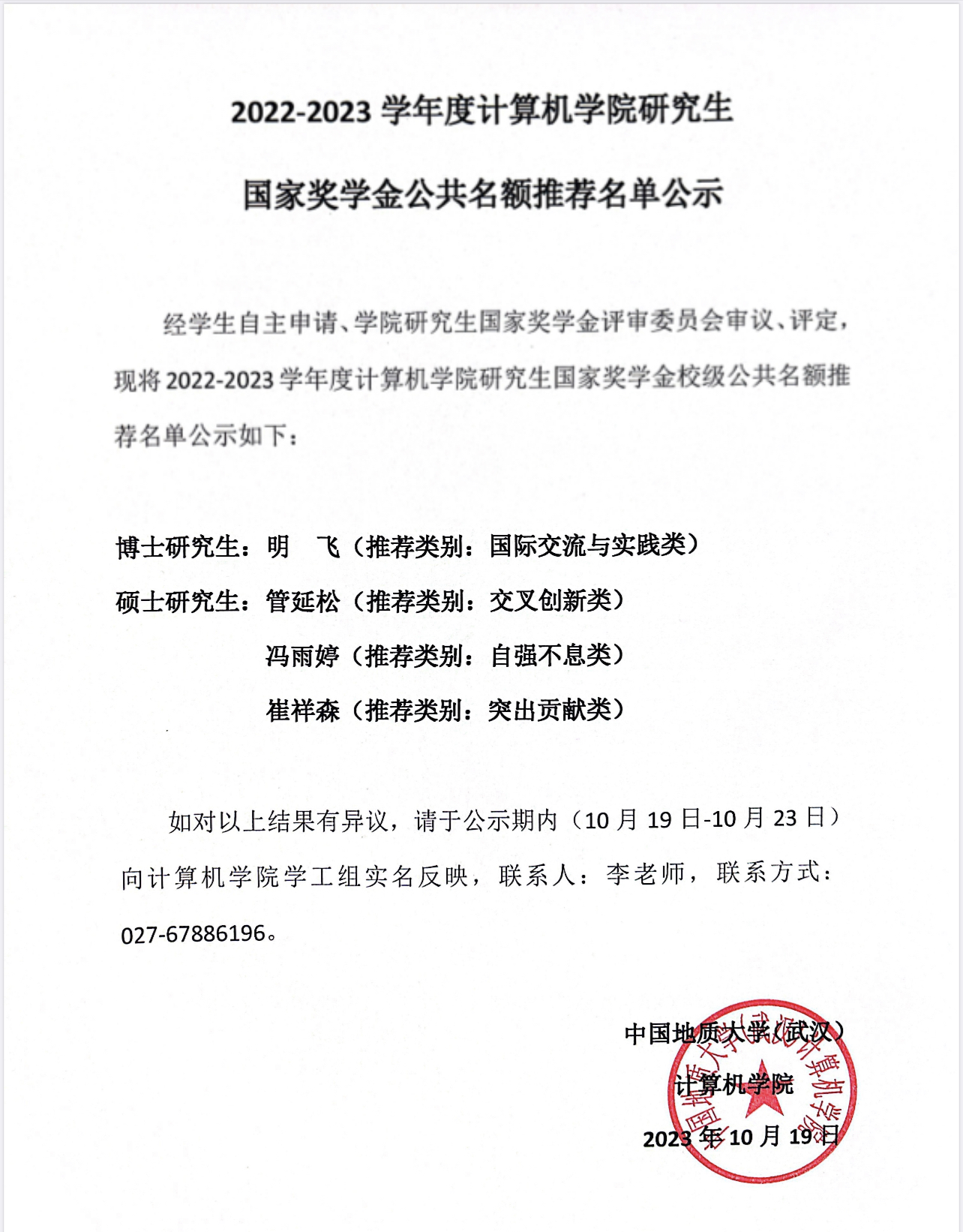 2022-2023学年计算机学院研究生国家奖学金公共名额推荐名单公示