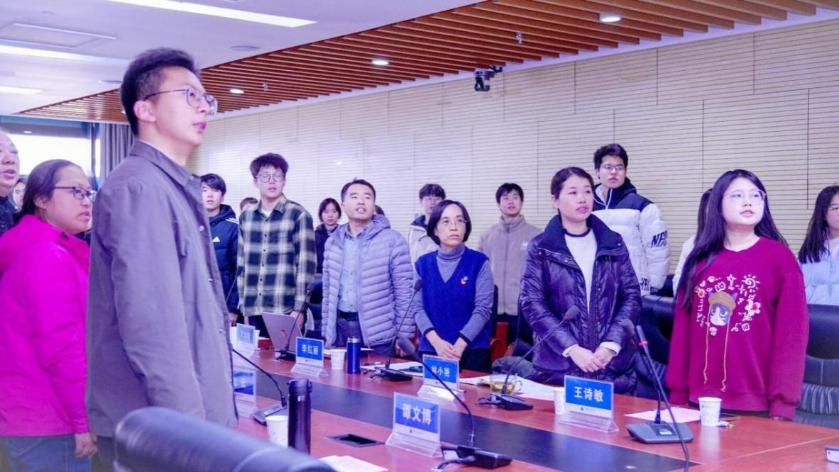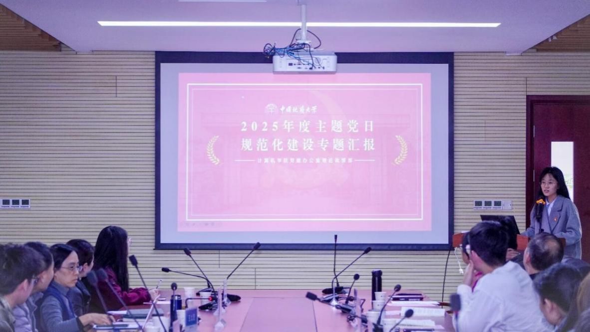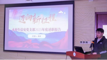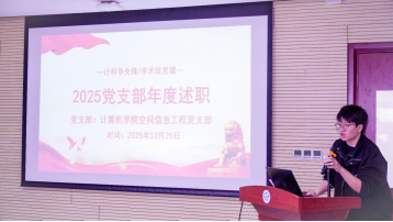 随后,谭文博对计算机学院学生党建办公室年度工作进行汇报,分别从夯实基础,学生党建规范有序;创新亮点,理论学习与仪式教育创新提质;理论实践结合,坚持党建引领三个板块进行汇报。未来学生党建办公室将继续优化党员教育体系,持续提升学生党建工作质量,为学院高质量发展提供坚强保障。理论政策部副部长李紫晗汇报2025年度主题党日规范化建设专题工作,对年度主题党日巡视情况进行通报并强调主题党日材料提交要求。