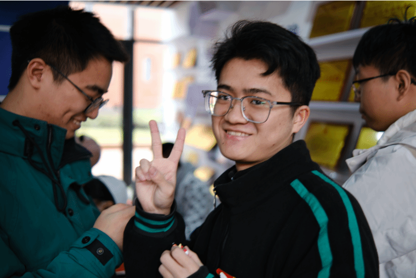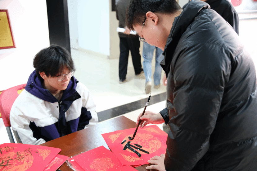 案几铺展红纸,笔墨早已备好,书法达人谭文博老师现场挥毫,笔走龙蛇间,兼具力量与美感的字迹跃然纸上。“代码无bug,科研步步高”“算力赋能,梦想启航”……同学们纷纷围聚,或求取专属定制的新春墨宝,或亲手执笔体验书写之趣。笔尖与纸面的摩挲声中,传统书法艺术的魅力悄然流淌,更将计科人的专业追求与新年期许巧妙融合,每一笔都饱含对新一年的热忱祈愿。