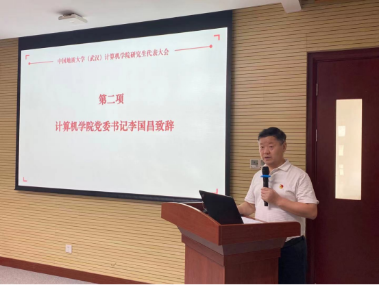 大会在雄壮的国歌声中拉开帷幕。会议伊始,计算机学院党委书记李国昌致辞。他指出研究生是学院科学研究、科技创新、学科发展的主力军,是院风学风的重要塑造者,而团委和研究生会是研究生自我管理、自我教育、自我服务的重要组织,能否发挥研究生科学研究、科技创新、学科发展主力军作用,浓厚院风学风,关键看团学骨干。对此,他希望团学骨干们要不断提高政治站位,坚定理想信念;要努力提供一流服务,围绕研究生成长和学院发展实际开展今后的工作;要对标一流,加强与兄弟学院、兄弟高校的交流,取长补短;要坚持团结,相互包容欣赏,心往一处想,劲往一处使;要严格自律,学会在大家的监督下工作,迎难直上,再创新高。