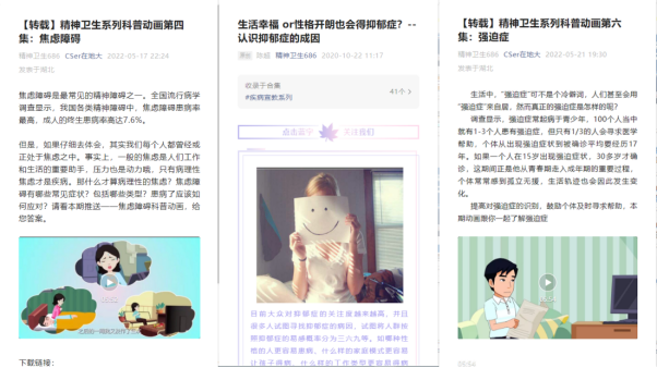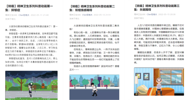 为加强同学们对心理健康知识的了解,在心理健康宣传月中,我院转载了“精神卫生系列科普动画”共计六集,转载分享了抑郁症成因和焦虑自助等科普文章。本系列科普视频和文章的传播,为心理健康宣传月塑造了良好的氛围。