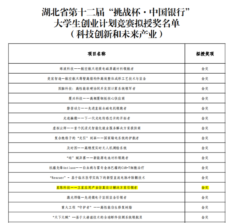 近日,湖北省第十二届“挑战杯·中国银行”大学生创业计划竞赛决赛顺利落下帷幕,我院学生团队“星陈科技——卫星应用产业仿真设计解决方案引领者”荣获科技创新和未来产业赛道金奖!