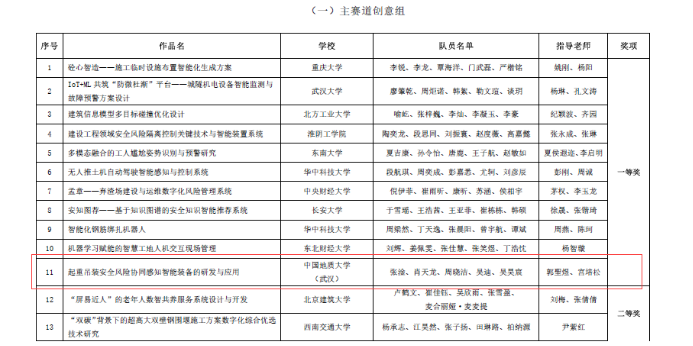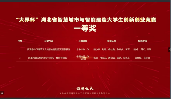 据悉全国智慧城市与智能建造大学生创新创业竞赛是当前工程管理领域影响力最大、影响范围最广的学科竞赛。本次比赛,中国地质大学(武汉)计算机学院2021级本科生吴昊宸与经济管理学院工程管理专业组成联队(团队成员:张淦、肖天龙、周晓洁、吴迪、吴昊宸),以参赛作品“起重吊装安全风险协同感知智能装备的研发与应用”(指导老师:郭聖煜、宫培松)进入决赛,最终从大赛主赛道来自98所高校的107支队伍的参赛作品中脱颖而出,荣获一等奖。此前在“大界杯”湖北省智慧城市与智能建造大学生创新创业竞赛中,该参赛作品已经获得一等奖。