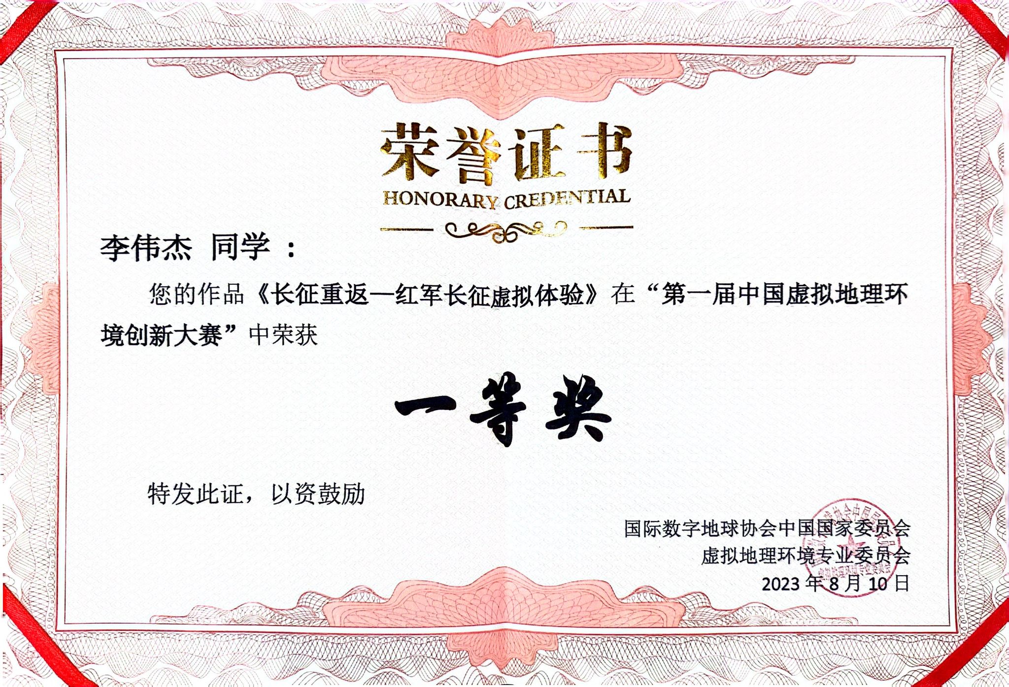 编者按:经过激烈的角逐,在吉林延边举行的2023年第一届中国虚拟地理环境创新大赛圆满落幕。我院的李伟杰、郝孟璂、王洋、刘建东、郑诗语五位研究生组成的“长征重返-红军长征虚拟体验”团队在这场赛事中展现出色的实力,一举拿下创意原型赛道一等奖。以下是团队的参赛历程以及每位成员参赛过程中的感悟。