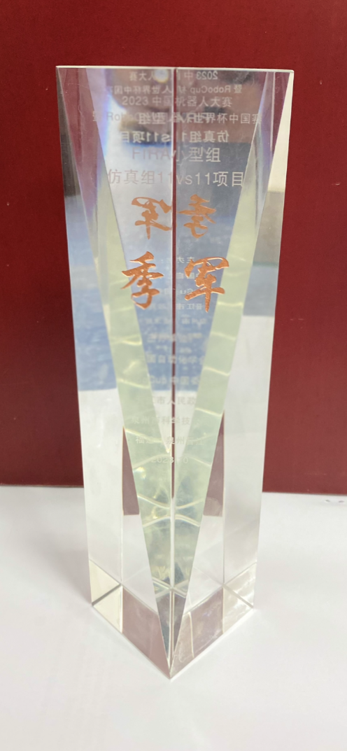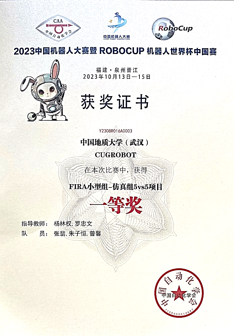 由张翡、朱子恒和曾馨等学生组成的FIRA仿真组5vs5项目代表队和由夏倩倩、王哲、李婉雪和王晶鑫等学生组成的FIRA仿真组11vs11项目代表队,从单个机器人的运动控制到物理模型预测,再到多个机器人的路径规划和整个机器人队伍的阵型协同优化,机器人代表队在指导老师的带领下日夜奋战,不断攻克难题,不断进步。经过小组循环赛、淘汰赛和最后的决赛,他们凭借高超的技战术水平和稳定的表现取得了两个季军和两个一等奖的优异成绩。