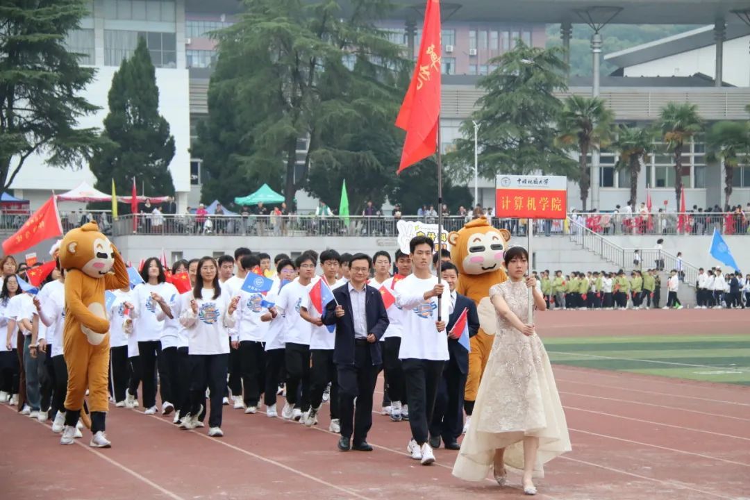 整齐的乐点中,计算机学院的方阵踏着晨光而来,脚步铿锵有力,气宇轩昂。简明的院服掩藏不了计科学子的蓬勃朝气,两只引人注目的程序“猿“走在队伍两侧,与现场的观众互动着,为方阵增添了一抹明艳的暖黄。同行的还有计算机学院的教职工们,他们不仅是我们学业上的引路人,也是我们最坚强的后盾。