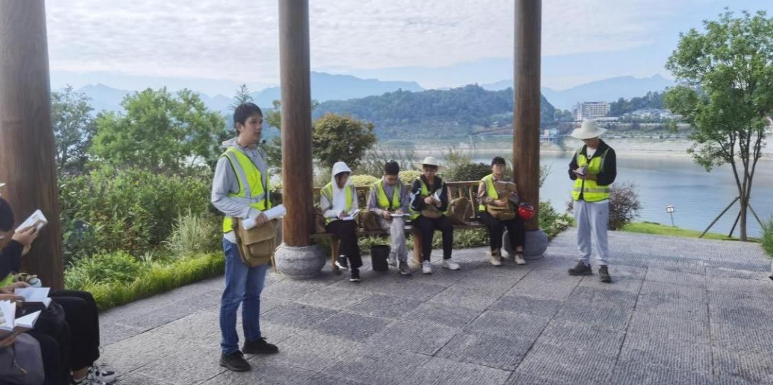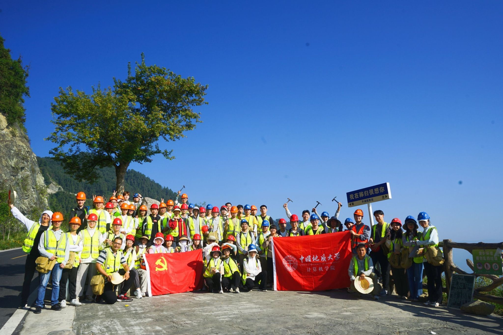 在蓝天白云、绿水绕山的美景下,全体师生在观景台上合影留念。除了实习实践教学活动之外,临时党支部组织开展了丰富多彩的活动,将思想政治教育和实习实践教学融会贯通。