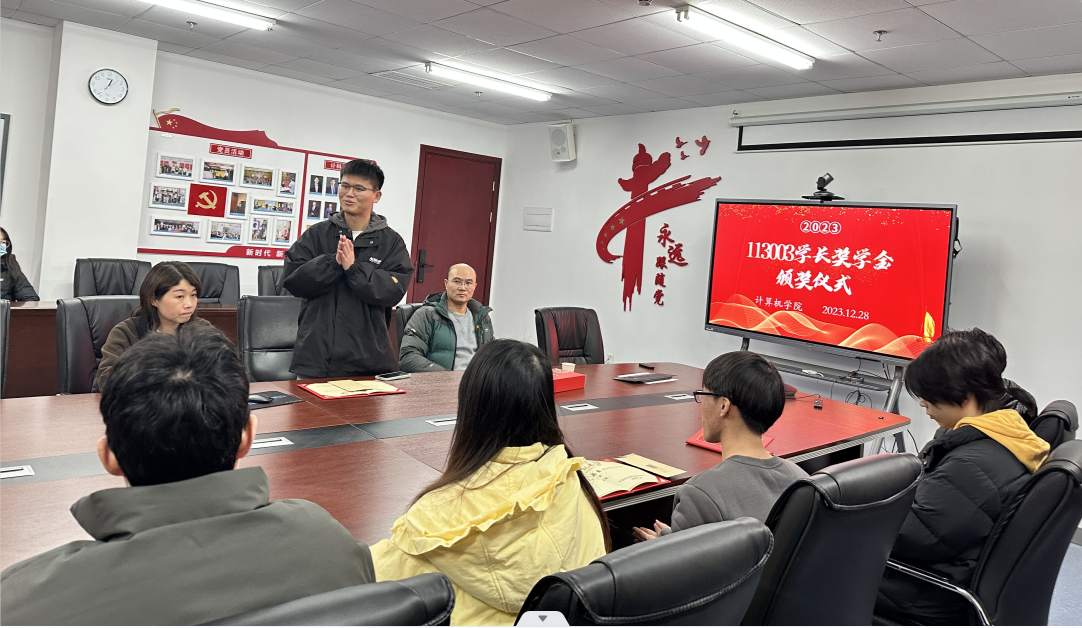 明媚的阳光从窗倾撒到整个屋子,给寒冷的冬日带来了温暖。我们齐聚一堂,见证一场精神的播种。2023年12月28日,计算机学院举办了“111003班学长奖学金”颁发仪式,111003班代表、学院龚文引教授,辅导员闫维蓉,教师代表郭晓兰,奖学金获得者2020级朱佳睿、2021级王晶鑫、2022级姚单铭,部分学生代表参加。学院党委副书记林小艳主持颁发仪式。