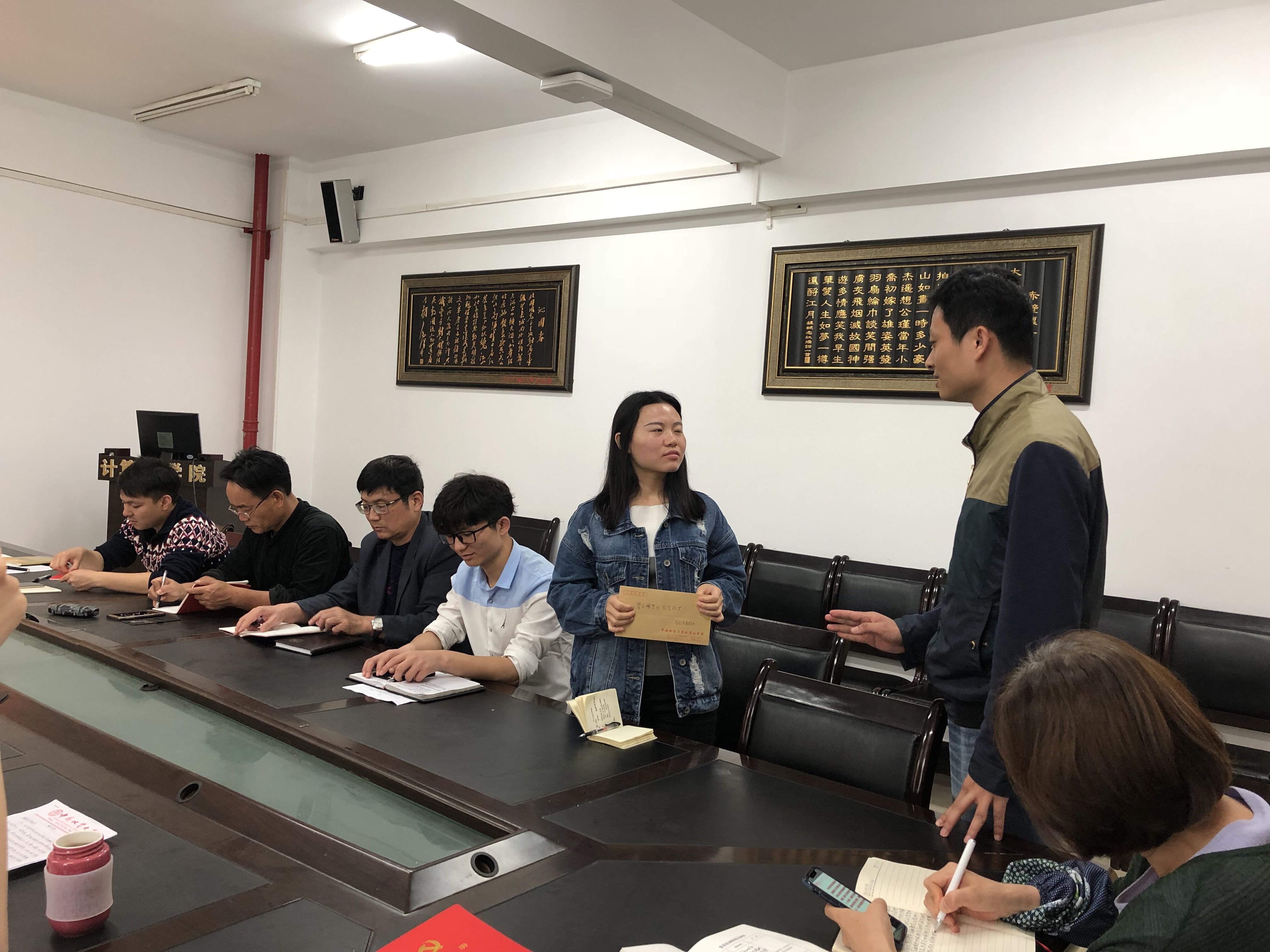 随后,支部“三个一工程”帮扶对象,我院研二学生廉颖同学介绍了2017年的学习、生活等方面情况。她说,她研一已经修完全部课程,研二上已经完成了导师的项目并顺利上线。现在即将到“爱奇艺”公司实习,各方面情况都有条不紊的进行着。生活上也逐渐摆脱困境,这都得益于学院的关心和帮助。大家听了非常的欣慰,表示学院是其坚强后盾,让其通过努力学习,改善自己的生活,同时为社会做出贡献。石剑峰同志代表支部还向其送去了慰问金,希望她不懈努力,成长成材!