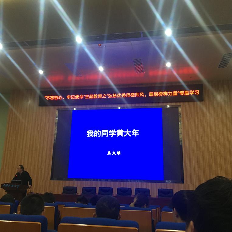(通讯员:宋艺童)为贯彻和落实“不忘初心、牢记使命”主题教育的各项工作任务,强化“弘扬优秀师德师风,展现榜样力量”专题的学习效果,2019年11月21日下午,计算机学院邀请了黄大年同志的大学同班、同宿舍同学,我校材化学院孟大维教授到我院做专题报告,介绍黄大年同志的先进事迹。本次学习活动由院党委书记吕军同志主持,学院全体师生党员参加。