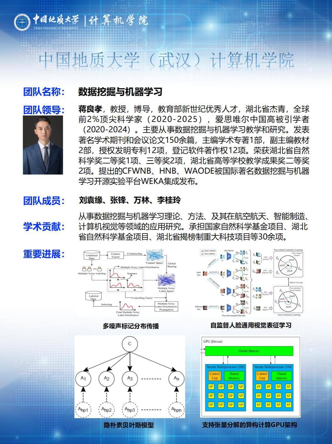 中国地质大学(武汉)计算机学院蒋良孝教授领导的数据挖掘与机器学习团队连续获得国家自然科学基金项目、湖北省自然科学基金重点项目、湖北省揭榜制重大科技项目等资助,自主研发数据挖掘与机器学习系列理论及其应用创新成果,发表著名学术期刊和会议论文500余篇,授权国家发明专利50余项,登记计算机软件著作权30余项,出版教材专著10余部,荣获省部级以上奖励10余项。与国内外同类产品相比,具有高效和鲁棒的特点,目前已经在航空航天、智能制造、计算机视觉等领域推广应用,并获得广泛认可与好评,具有广泛的市场前景和预期经济效益。