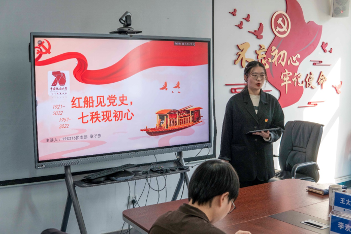 19C216班团支部书记章子萱以“红船见党史,七秩现初心”为主题,讲述了红船精神的实质内涵和现实意义。