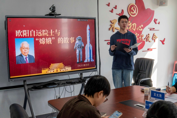 八名团支部书记依次进行演讲。196021班团支部书记童志成以“欧阳自远院士与‘嫦娥’的故事”展开讲解,学习探月精神的实质内涵。