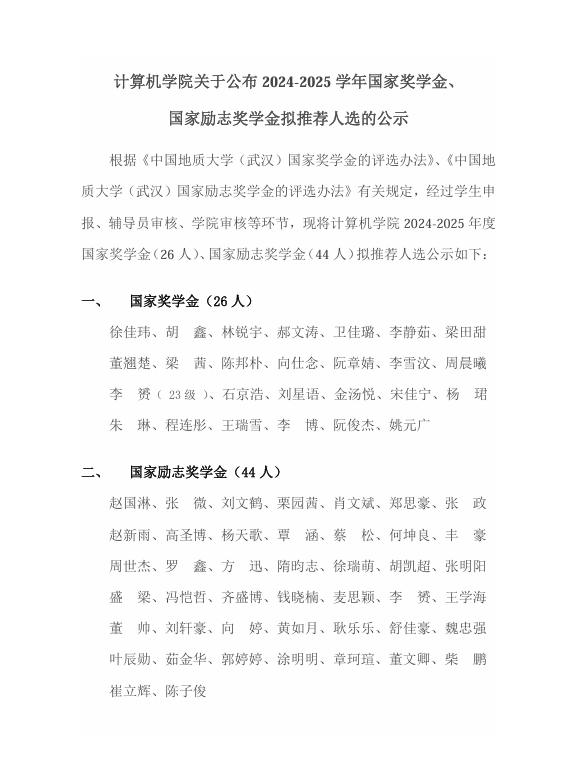 计算机学院关于公布2024-2025学年国家奖学金、国家励志奖学金拟推荐人选的公示