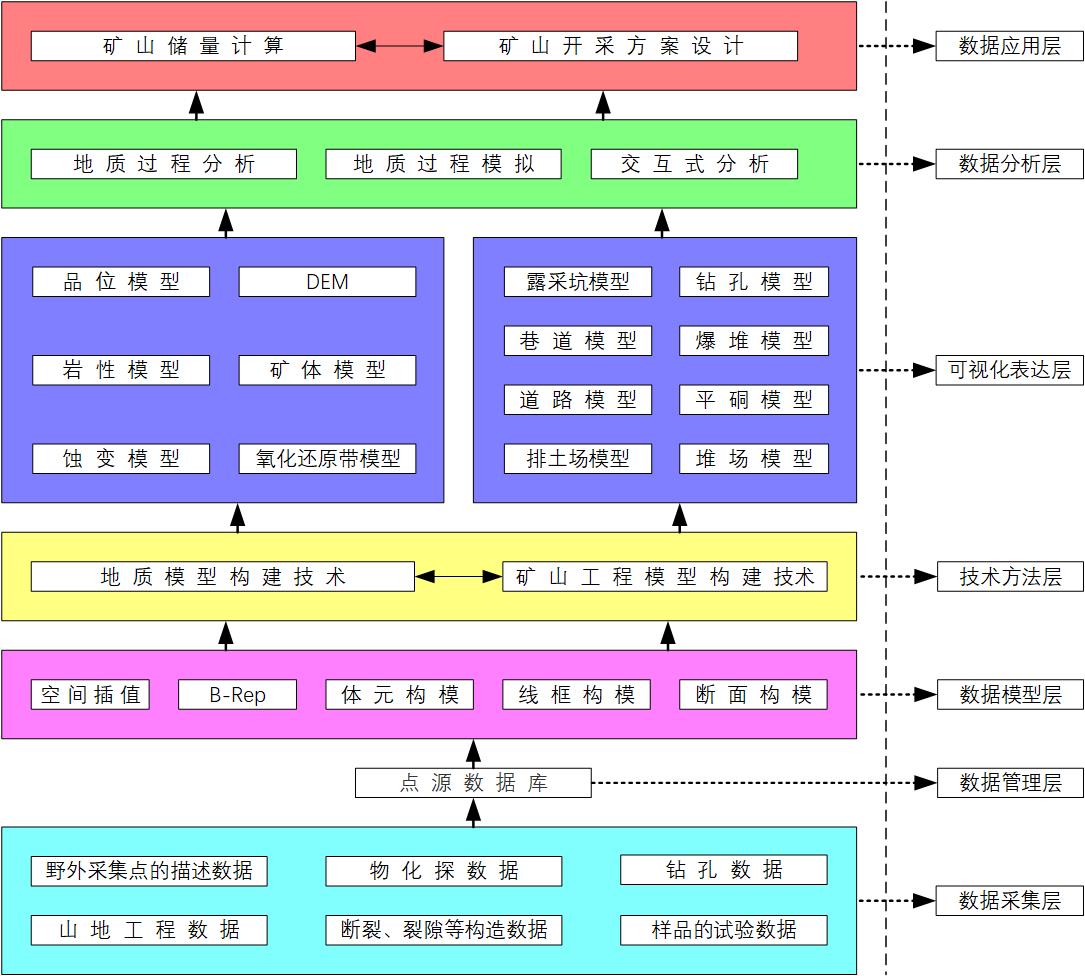 数字矿山系统服务于矿山生产的数字化转型和高效运行。数字矿山的信息框架包含矿山信息运行机制与保障系统、矿山信息技术系统、矿山信息增值服务系统等层面,具有多层次特征。“数字矿山”建设所面临的关键技术包括:(1)地上地下多源、多维、多尺度、多时态、多主题三维空间和属性数据一体化存储、管理技术;(2)数据挖掘和数据融合技术;(3)地质体三维空间分析技术;(4)地质体矢量剪切技术;(5)三维表达可视化、过程可视化、分析可视化、设计可视化和决策可视化技术;(6)动态品位模型与市场快速应对技术,包括矿体和采空区品位模型的动态构建技术、矿山最低可采品位动态确定和实时经济评价技术;(7)矿体多重空间变异性自定义拟合、分析及快速对比分析当量品位自动折算、单矿体自动圈定、基于空间关系的夹石及采空区扣除技术;(8)多S的系统集成技术。